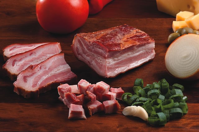 O bacon Casa Velha é elaborado a partir da barriga do suíno, onde é pendurada em varas para o processo de defumação. Ele pode ser consumido das mais diversas formas, picado em cubinhos nas feijoadas, em saladas, massas, ou ao seu gosto, use sua imaginação.